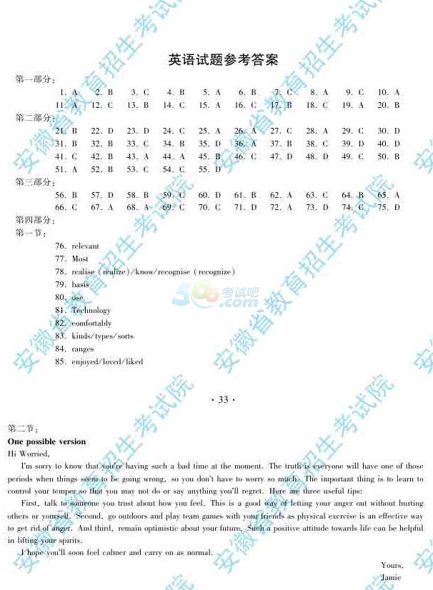 2014安徽高考英语试题及答案