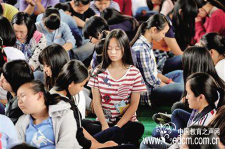 “你听不见嘈杂的人群声,上课铃也越来越远,现在的你,感受到平安、祥和、安静。现在想象你正站在美丽的花园里,植物和花朵都沉浸在柔和的阳光下……”一幅世外桃源的画面出现在同学们的脑海里,此时篮球场变成了大花园。