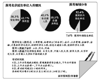 与往年研究生报考相比,今年取消了“年龄一般不超过40岁”的限制,据了解,今年北京地区共有112448人报名参加研考,其中报考京内招生单位的占92.4%,报考外埠招生单位的占7.6%。报考北京招生单位的考生中,非应届生占四成多。报考专业学位研究生的考生人数近四成。