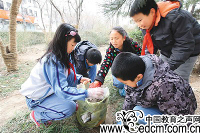 北京 东城区织染局小学学生到公园捡拾废弃物