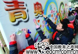 学生在展板上贴上自己的祝愿