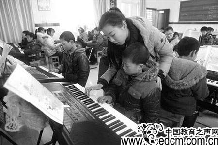 王媛媛抱着电子琴走进教室,开始教大家弹唱。教室里很快传来一片歌声、笑声。