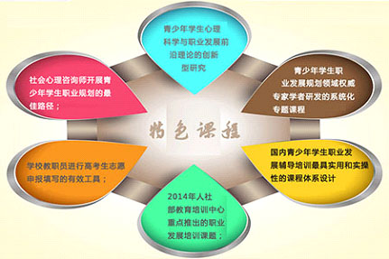 2013年,人力资源和社会保障部教育培训中心重点推出的“青少年学生职业发展辅导师”岗位能力认证,其是以心理学、管理学、职业生涯规划理论为基础,结合青少年心理特征和未来的职业成长需求,从性格、能力、兴趣、价值观多维度的帮助学生确立职业目标、选择职业道路,并确定行动方案的职业发展辅导体系,也是我们集合各高等学府、国家级研究院所及知名专业机构的专家学者共同研发的一套教学培训体系。为了更好推动这项工作的开展,我们不仅为教师举办系统培训和实践教学,还在各中(小)学校创设校园职业发展辅导站,提供专业咨询、完善档案管理,实现辅导学生健康成长的目标。