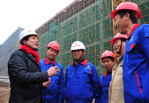 2月23日,孙东林(左一)在武汉一工地和农民工交谈。