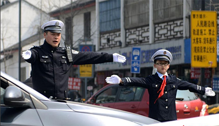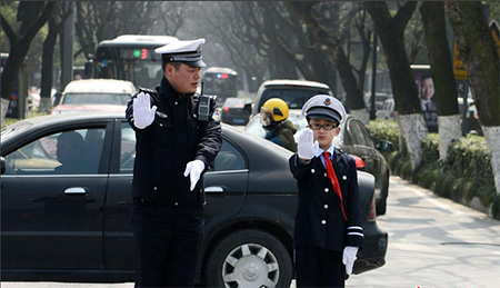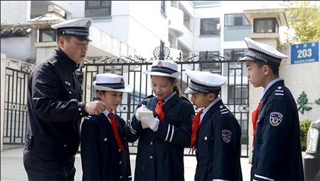 3月11日,“3.14国际警察日”前夕,苏州市东中市实验小学组织该校“东旭少年警校”的队员们,身着统一“小交警”服装,在该市姑苏交巡警支队第四中队蒯警官的带领下,走上街头,与交警一同“执勤”,现场对违章停放车辆处置、拥挤道路交通指挥等进行了体验,圆了他们的交警梦,也体会到交警一天工作的辛苦。