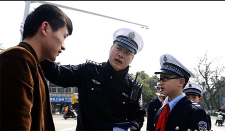 图为蒯警官对违停车辆司机进行处置,“小交警”在一旁认真学习