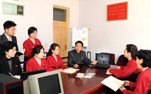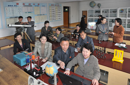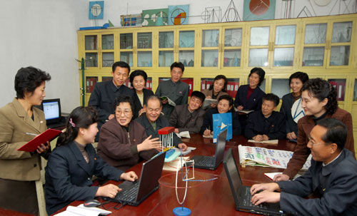 平壤牡丹峰区仁兴初中的教师们根据新教育纲领的要求积极努力改善教育法