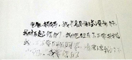 记者看到玲玲写的遗书是这样的:“爸爸妈妈,我半期考试没考好,我对不起你们,我已经走了,不要找我,(照顾好)阿公阿婆,请原谅我的不校(孝),我爱你们。——你们的女儿”