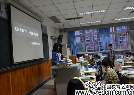 形式:这次团组织生活,各班的经过精心策划,用多种表现形式展示了“我的中国梦——奋斗的青春最美丽”这一主题。如,“青春中国”演讲比赛、革命歌曲联唱、讲故事(回忆党的奋斗历程)、革命电影展播、五四知识竞赛、团员思想道德素质讲座等。