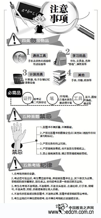 教育考试院工作人员提示,7日正式考试的时候,考生进入考场后应按《考试操作指令》要求完成答题前的准备工作,考场分发题(卡)后,应按考场提示先将姓名、考号准确填写在答题卡指定处,再将本人条形码粘贴到答题卡相应位置,然后检查核对本人的试题页数、题数和答题卡上的题数是否完整、对应。