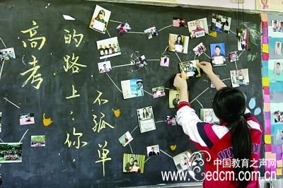 金陵中学高三(6)班的教室,平时用来做黑板报的区域,出现了“前有老师,后有家长,高考的路上你不孤单”的字样,围绕着这一主题,张贴着许多照片,这些照片有学生个人的阳光照,还有各个家庭里的“加油照”。