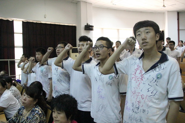 为了把心中对老师的感激、对学校的眷恋,化作前进的动力,全体高三学子紧握右拳、宣读了毕业誓词,随后校领导向向优秀毕业生代表们颁发了荣誉证书。接下来由我校的红色“1+1”党团共建大学---北京外国语大学的优秀代表们带来了对我校高三学子的激励和祝福。