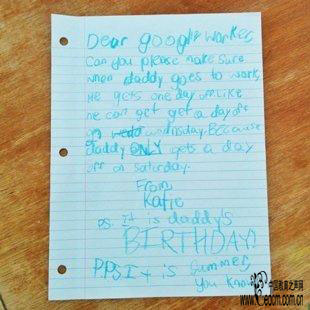 这个名叫凯蒂的女童用蓝色蜡笔在议长便签纸上写道:“亲爱的谷歌员工,希望你能让辛勤上班的爸爸休息一天,假如是周三更好,因为他只有周六才放假。”小女孩接下来解释,那天是爸爸的生日,而且更是适合放假的夏日。