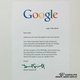 他向女孩解释说,她的爸爸忙于为全球数百万的谷歌用户设计美丽而有趣的东西。他又打趣说,知道她的父亲快要生日,也了解在夏天的周三放假是件大事,因此决定让他在7月首周休息一整个星期。
