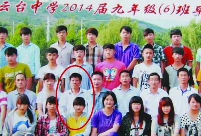 帖子中附有四张不同初三班级的毕业照片,记者注意到,在初三(6)班的毕业照中,下方第二排坐着的是老师,中间位置一名穿白衬衫戴眼镜的男子明显与边上两人位置不太匹配,相对比较靠前,其两只胳膊分别挡在边上两位老师的胸前,该男子在其他三张照片中表情与在(6)班合影中的表情完全一致。
