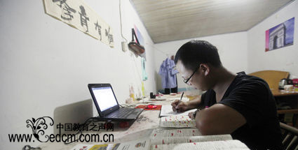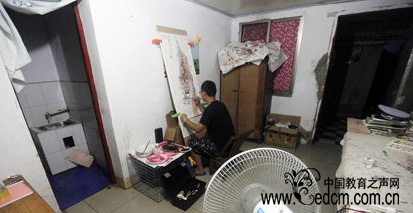 记者随谢彪爬上了他居住的“七楼”,一个不足20平方米的小房,隔出了几个平方米作为厨房,卧室与书房、画室合而为一。吃过简单的蛋炒饭后,谢彪开始了他坚持了5年的夜间“工作”。“初中一年级开始,我跟着老师学画,现在专门画老虎。”谢彪说,自己自小习画与书法,这样能寻回内心的平静。
