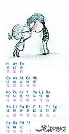毕业于北京工商大学化学与环境工程学院的钟静告诉记者,这些字母看似神秘,不过学化学的同学却一目了然,她说,这些都是化学元素,比如H是氢,At是砹,Tc是锝,Os是锇,As是砷。如果逐句翻译过来就是:“亲爱的,我深爱着你,你不可以不理我,心里不可以有他人,嫁我吧!”钟静笑称,这么含蓄的表白,还是会让学化学的同学得到真爱。