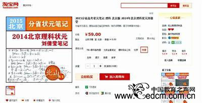 在淘宝网上输入“高考状元笔记”,可以跳出2298件宝贝,衡水中学状元、黄冈中学状元、哈三中状元笔记、北京文科状元、北京理科状元……几乎包罗各个省份状元的各科笔记,“宝贝详情”里的介绍显示,这些笔记除了翻印的手写版之外,还有电子版、照片版等各种形式。有些店家除了卖状元笔记外,还兜售所谓的“罕见高考状元原版试卷”。