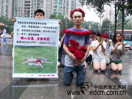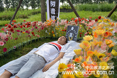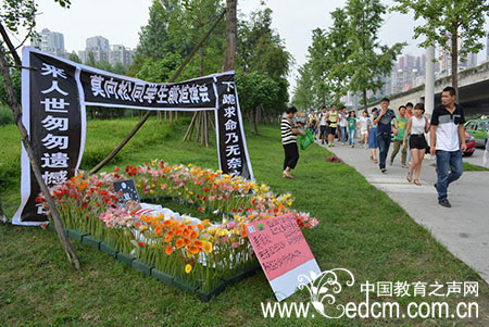 【必威体育官网网页版 8月12日消息】8月11日下午4点左右,在成都地铁2号线成渝立交站D出口外的一个草地上,阵阵哀乐萦绕在草地周围,在一片菊花簇拥的白布上,躺着一个面色苍白的少年。少年躺在菊花丛中,平静安详,整个气氛非常紧张切沉重。背后黑底白字“莫向松生前追掉会”几个大字特别扯眼。其中两副挽联“来人世匆匆遗恨千古,下跪求命乃无奈之举”更是留住了路人的脚步,几位老人轻轻的拭去了眼角的眼泪……整个追悼会有主持人和“死者”的亲人、朋友、同学和热心网友大约20人参加。追悼会简单介绍了死者莫向松的生平和一些家庭大概情况,持续约十分钟。