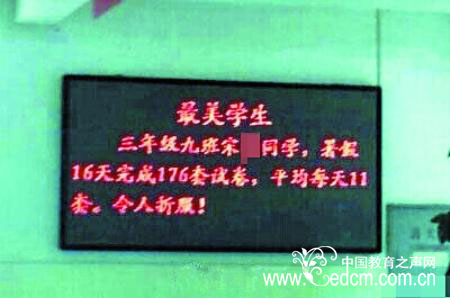 微博配有一张图片,在学校的电子屏幕上,赫然打着“最美学生三年级宋同学,暑假16天完成176套试卷,平均每天11套,令人折服!”的红字。消息一传出,立即引发网友的纷纷质疑:暑假期间为什么要留这么多作业?要把学生累成印刷机吗?