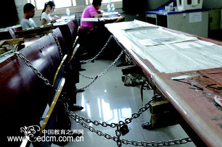 在济南大学第十教学楼5层,共有6间教室对自习学生开放。26日,记者在一间教室看到,几条长长的铁链将一排排桌椅捆住,不打开铁链上的锁便无法坐下。有的桌子上摆放了马扎,有的则用胶带封着板砖、石块,并贴着写有“重占拼命”、“血拼”的字条。