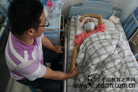 6月11日,即将硕士毕业的温婵,正在犹豫毕业后是留在福州工作,还是去男友罗海伟所在的城市合肥时,突然接到协和医院的报告单——她被查出患“急性白血病”。当天下午,温婵住院接受治疗,并把噩耗告诉了男友。罗海伟马上向单位请假,当天赶到福州。昨天上午,在病房外,罗海伟戴上口罩,用消毒液洗过手,领着记者到温婵的床前。罗海伟说,温婵身体很弱,他怕自己带了病菌,传染给她,每次洗完手,才进病房。