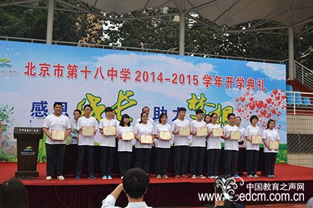 解说:本次开学典礼上,十八中学表彰了该校的优秀志愿者代表,领导为其颁发了荣誉证书并合影留念。