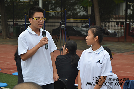 解说:感恩的心,感谢有你,父母是我们人生最初的榜样,教会我们许多。典礼特别设置了小记者现场采访的环节。采访同学,汤文浩和王毓婉两名同学分别讲述了父母给自己上过的生动一课。采访家长,初二四班蒋雨暄的爸爸表达了家长对孩子们的期望。