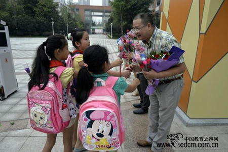 9月10日上午7时15分左右,记者赶到马先生所说星光学校,校门外,背着书包的学生们站在铁门外等待学校开门,而他们每人手中,拿着一支或几支玫瑰。 7时30分,一位穿着格子衬衣、戴眼镜男子将校门打开,冲着这群孩子们微笑,鞠躬,并逐一向他们打招呼,而孩子们将手中玫瑰递给他,并说道:“校长好。”,他就是该校校长瞿拥军,自从该校从2008年9月1日开始建校以来,他除了外出开会学习,每天都会准时在校门口迎接学生们。