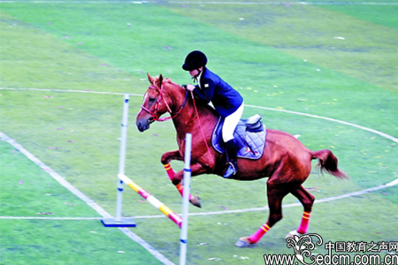 现场压轴的,是育才中学高二5班学生谢杜莹和3名马术俱乐部的同伴带来的马术表演。谢杜莹穿着帅气的骑士服,骑着一匹棕黄色的马儿,开始跨越障碍。第一个障碍物,很顺利地通过,谢杜莹拍拍马儿,以示鼓励。不过,跨越第二个障碍物的时候,临到栅栏前,马儿却突然扬起前蹄,退缩了。