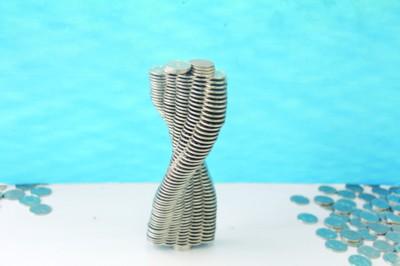 “最难的就是封顶部分。”作品原创之一吴旺杰说,因为最中间部分是镂空的,没有支撑点,必须要运用力学知识,使硬币一个压一个,还需要力的相互作用。