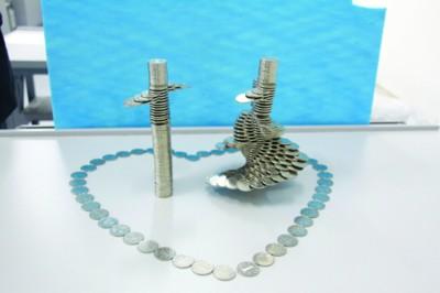 另一件作品赢得了众多女生的青睐。“这件作品叫做‘爱之华尔兹’,用500余硬币搭建了两个正在跳华尔兹的舞者。”大三学生费凯旋说,刚开始只准备搭建一个跳舞的人,但感觉一个人跳舞太孤单,临时决定为它增加一个舞伴,希望同学们也早日找到自己的“舞伴”。