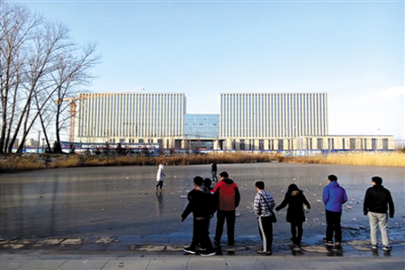 昨天下午,北京航空航天大学沙河校区教学楼中间,被学生称为“南湖”的湖面已结冰,约百米宽,其中湖边部分冰面已经化掉,从冰窟边缘看,冰层厚度约为六七厘米。