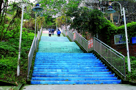 这条石梯位于西南大学从教学楼往宿舍竹园方向的必经路上,大学4年来,该校大四学生李强每天都要从这里经过。“要毕业了,学校的一草一木都变得亲切起来,舍不得我每天反复走的百步梯。”昨日,李强说,不知道自己什么时候从刚来的“不适应”变化成现在的“离不开”。7日凌晨,李强和室友偷偷把原本青灰的石梯涂鸦上了蓝色、绿色和红色的油漆。李强说,希望这段“彩虹梯”能给自己留些青春的纪念,也让学弟学妹们将来路过这里时能够在冬天感到一些温暖。“好有情调,走在上面的感觉太美妙了。”历史文化学院的韩慧雯说。