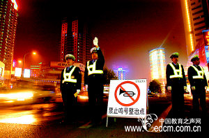 记者昨天在这个十字路口站了一个多小时,听到的汽车喇叭声不超过10次,有3名司机受到民警处罚。