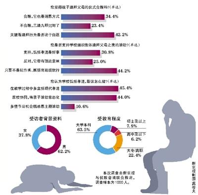 1月11日,上海嘉定区民办的斌心学校举办“孝敬文化节”,800多名学生齐刷刷在父母面前下跪磕头,在父母的头上拔下一根白头发,以作永远留念。此事引发网民热议,而该校校长回应,读经典、扬孝敬是学校特色。对此,公众怎么看?本期“京报调查”(新京报与优数咨询联合推出)就此展开调查。