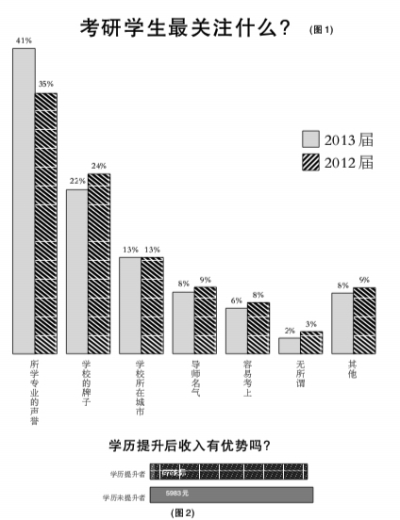 读研的本科毕业生选择院校时会有哪些考虑?来自麦可思的调查发现,2013届本科毕业生中,读研人群选择研究生院校时最关注的因素是所学专业的声誉(41%),比2012届高了6个百分点;其次是学校的牌子(22%),比2012届(24%)略有下降。研究者认为,这或许说明学生对专业的学术性关注度正在提高。(图1)
