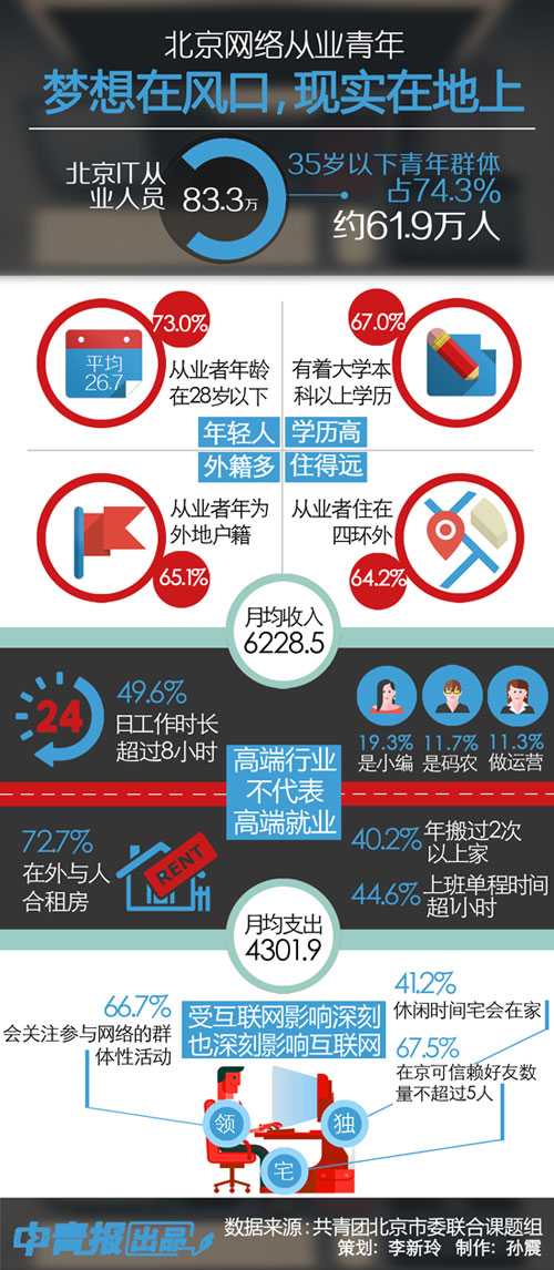 调查还揭示,该群体人均月支出达到4301.9元,其中生存性支出比例较大,房租或房贷就占据了42.5%,人均月支出占月收入的七成以上的人数达90%以上,基本属于收支双高的“穷忙族”。而且,住房状况不稳定,拥有自购住房者仅占25.6%,而其中又有67.8%是北京户籍,即非京籍网络从业青年购买住房的人仅占网络做作业青年群体12.3%。租房者的平均月租金是2146.6元。