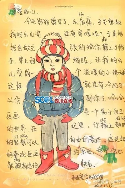如果遇到降温,周艳还提醒女儿多添衣服,于是一个戴着帽子手套、穿上羽绒服、脚蹬雪地靴“全副武装”御冬的女孩儿的形象出现在她寄往女儿的信中,周围还有一些小字——“今天妈妈感冒了,头很痛。于是想起我的幺儿有没有穿暖呢?妈妈自作主张给你戴上了帽子,穿上羽绒服,让我的幺儿变成一个温暖的小棉球,这样就没有冷风可以伤到你了……”