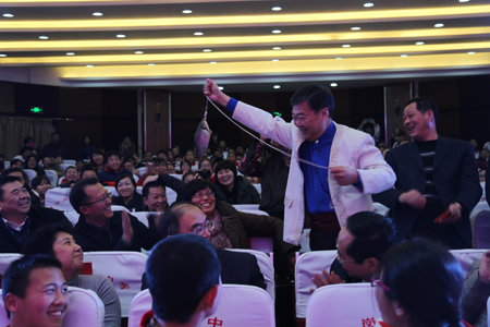 北京杂协理事王立民为大家带来了一场精彩的钓鱼表演。神奇的魔术配以生动的表演,让全场捧腹大笑,无不惊叹其神奇之处。他从鱼缸里、地上、学生外套里、观众席上都能钓到各种鱼。小至几厘米的金鱼大到几斤重的鲤鱼,现场气氛极其活跃。同时也向观众表达了年年有“鱼”之意。