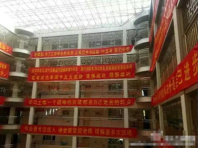 网友@东方吴奇隆16日发微博称,为了不让学生跳楼,真是下了血本了,并配了4张图片,图片显示一个6层高的楼体每层的楼道都安装上了铁栏杆,每层都拉有红色横幅。横幅上的信息显示,“老师们为了二中学生的未来,让我们全力以赴,15年高考(课程),我们必胜”。记者通过多方证实,图片拍摄的为衡水二中教学楼。