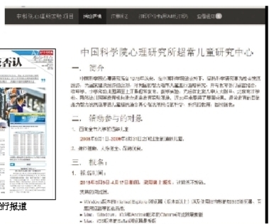 北青报记者近日发现,去年闹得沸沸扬扬的超常儿童研究中心“超常儿童筛选”活动今年再次悄然启动,只是称谓从去年的“中科院心理所超常教育实验班招生测试”变成了今年的“入学水平评估”。今年评估报名通知显示,报名刚于4月17日结束,初试初步安排在5月1日。