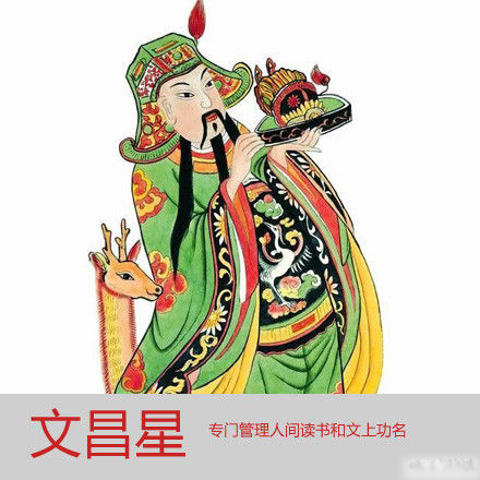 文昌星,简称文星或文曲星,在汉族民间信仰中占有重要地位,是天上星官的名字。文昌帝君,一般认为他是主管考试、命运,及助佑读书撰文之神,是读书文人、求科名者所最尊奉的神祇。其受汉族民间的奉祀,从周朝以来,历代都相沿制订礼法,列入祀典。明朝景泰年间,景宗皇帝在北京新建一座庙宇,每年二月初三,遣人举行盛大的祭典。清朝年间,更加崇奉此神,嘉庆六年,仁宗皇帝也勒命礼部,把此神编入祀典。在风水术中,常常会在家里设置文昌位,放置书桌、文昌结印等。