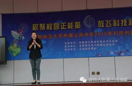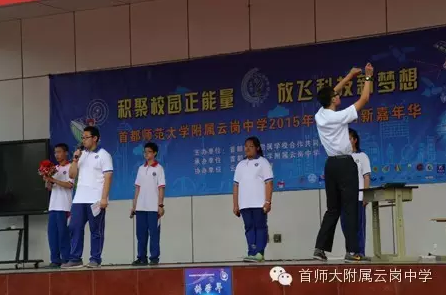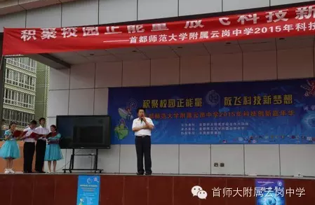 活动共规划了8个体验区,体验项目多达70多个,为云岗教育集群1000余名师生带来了科技盛宴。下午13:30分,首师大附属云岗中学2015科技创新嘉年华隆重举行,活动由高一1班翱翔计划第八批学员宋一鸣、高二2班科技创新爱好者陈嘉慧、初一郗冠华同学和王欣悦同学主持。开幕式上,首师大附属云岗中学张进兵校长致欢迎词,张校长向参与本次活动的嘉宾介绍了学生近几年的科技成果,对多年来支持云岗中学科技教育的资源单位表示感谢并提出了殷切希望。首都师范大学基础教育研究中心副院长王海燕也对本次嘉年华活动做出了充分的肯定,她表示首师大将不遗余力的支持云岗中学的发展,争取在不久的将来将学校建设为特色鲜明,内涵丰富的市级优质学校。