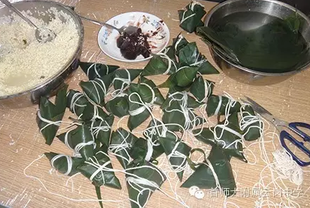 夏老师很细心,手把手地教师生包,让大家包粽子的兴趣一下子被激发起来。芦校也过来和我们一起包粽子,还亲自教学生包。有的同学包的粽子是三个角的,有的包的是四个角的,有的是等腰三角形的,有的是等边三角形的,有的粽子包着包着就露出米来,大家笑成一片,办公室满是欢乐的气氛。很快,一盆粽子包好了,夏老师赶紧端到食堂去煮,同学们还想在放学之前尝尝自己动手包的粽子呢!