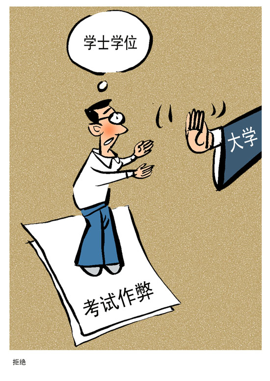 “我和几个同学在考试时会一起合作作弊,有人负责找以前的考试题,有人负责整理答案,有人负责将答案缩印。”王檬说,在双学位考试中,作弊的现象很普遍,作弊的同学彼此并不会觉得不好意思。在她看来,周围不公正的考试现象也很多。她曾经在参加秘书证考试的时候,听到老师直接向学生保证交钱保过。该老师在给分时也会照顾与自己亲近的学生。