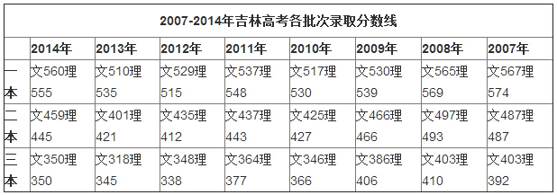 2007-2014年吉林高考各批次录取分数线