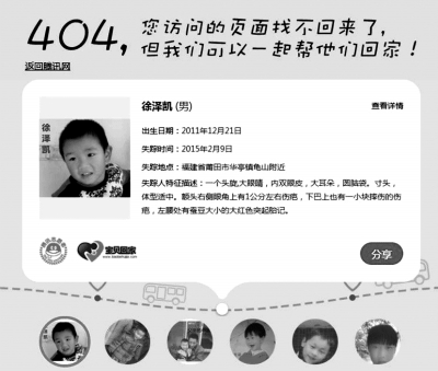 404报错页面上出现的:走失儿童寻找亲人公益广告。