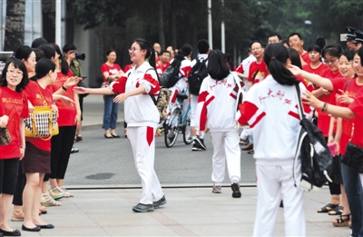 (昨日,人大附中,老师给考生加油鼓劲。当日,北京市中考拉开帷幕)