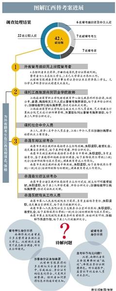 江西省教育厅相关负责人称,该事件依据多部门组成的联合调查组的调查处理情况,共有42名涉案人员受到处理。其中,对外公布的名单内有6名替考组织者及中介人员,对比此前媒体披露的信息,该部分涉事人员伴随调查进展而相应增加。目前,当地公安、检察机关仍在进一步调查案情。